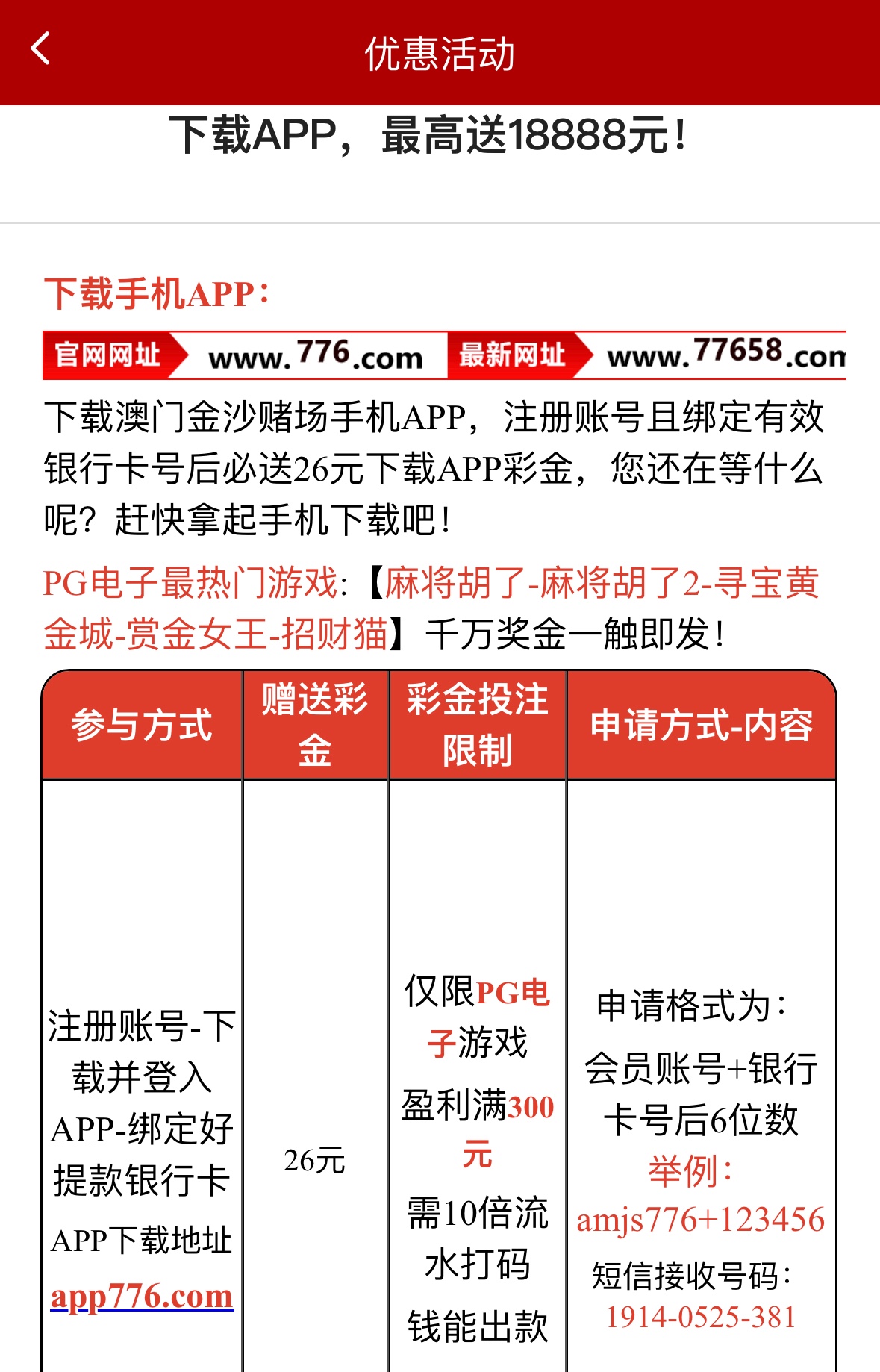 注册账号下载APP登入账号绑定号银行卡,仅限:PG电子,10倍流水,发短信的手机号:19140525381,短信内容是账号+银行卡后六位数,查IP,注册满一周还送7彩金