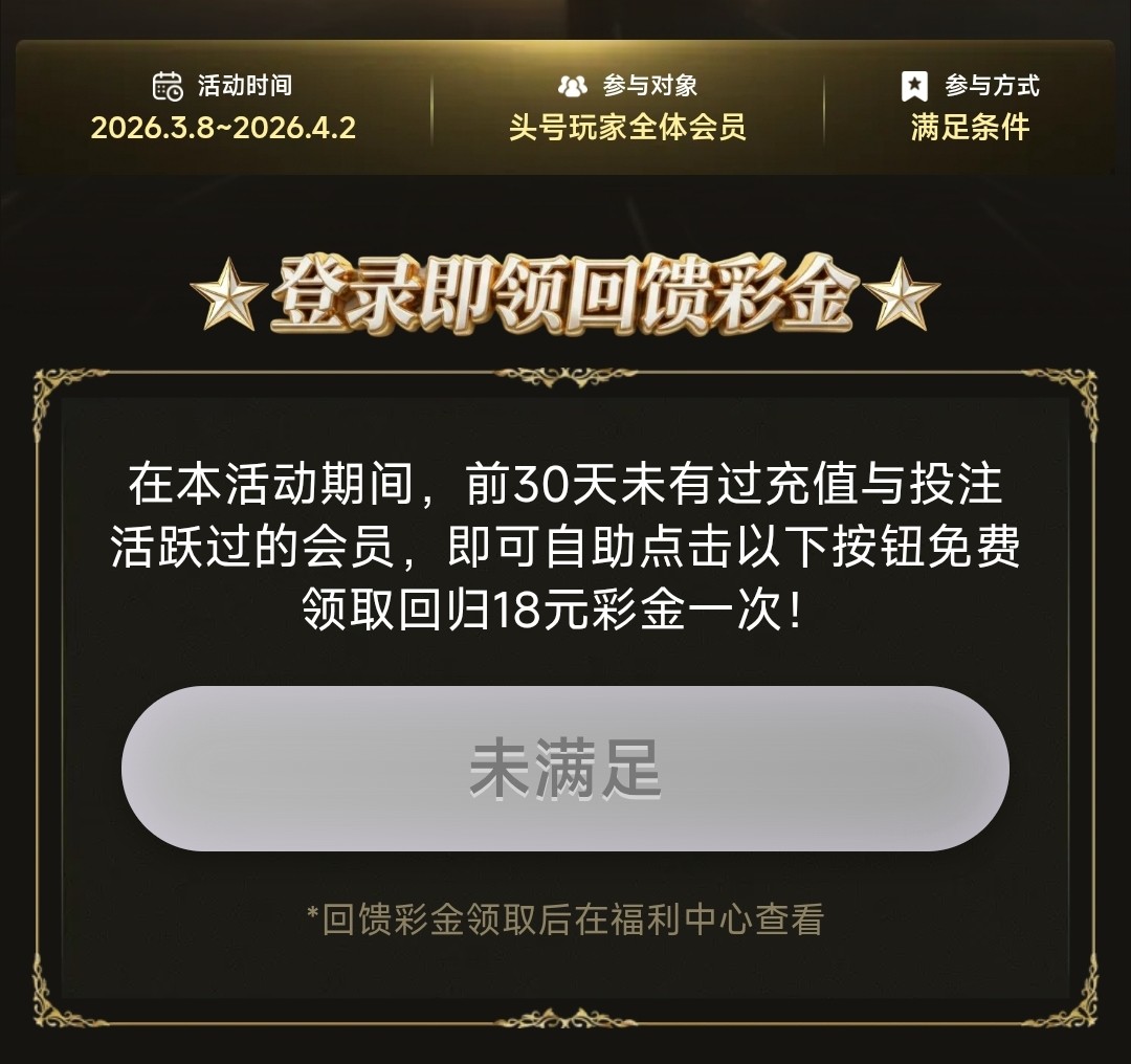 回归彩金需要账号一个月以上未活跃(历史存款300+VIP等级1以上)彩金8倍流水,符合可以上号领取一下彩金